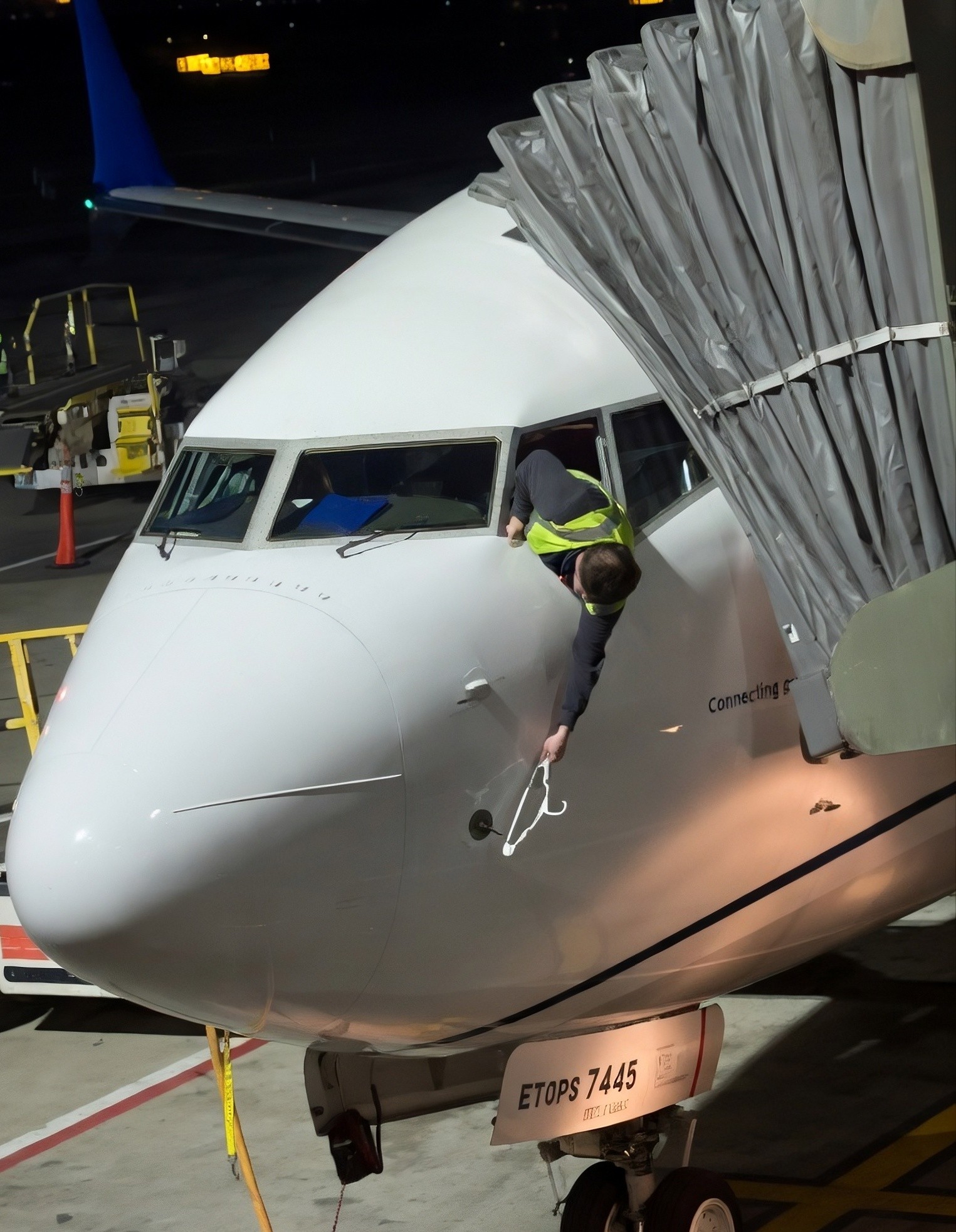 В среду вечером рейс United Airlines 1928, следовавший в Остин, был задержан на два с половиной часа. Задержка попала на видео: технические специалисты в светоотражающих жилетах высовывались из открытого окна кабины пилотов. Используя длинный тонкий предмет, похожий на проволочную вешалку, они пытались подтолкнуть небольшой компонент лопастной формы на носовой части самолета.